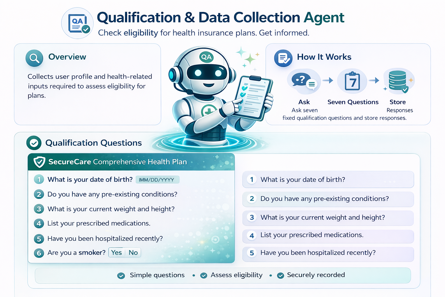 Ask seven fixed qualification questions and store responses.